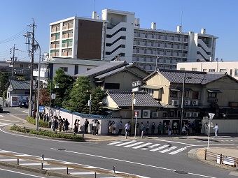開店1時間前だというのに、長蛇の列。 実は10:30から配られる整理券の列。 事前に調べてきたので、整理券をもらうために 参拝の前に並ぶためにやってきました。 いやおうなしに、期待値が上がります。