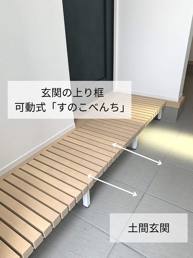 昔懐かしい土間玄関ですが、その利便性の高さから、今また注目されています! 玄関の上り框には、可動式の「すのこべんち」を造作。ちょっと腰かけて、縁側風にお使い頂くこともできます。 |