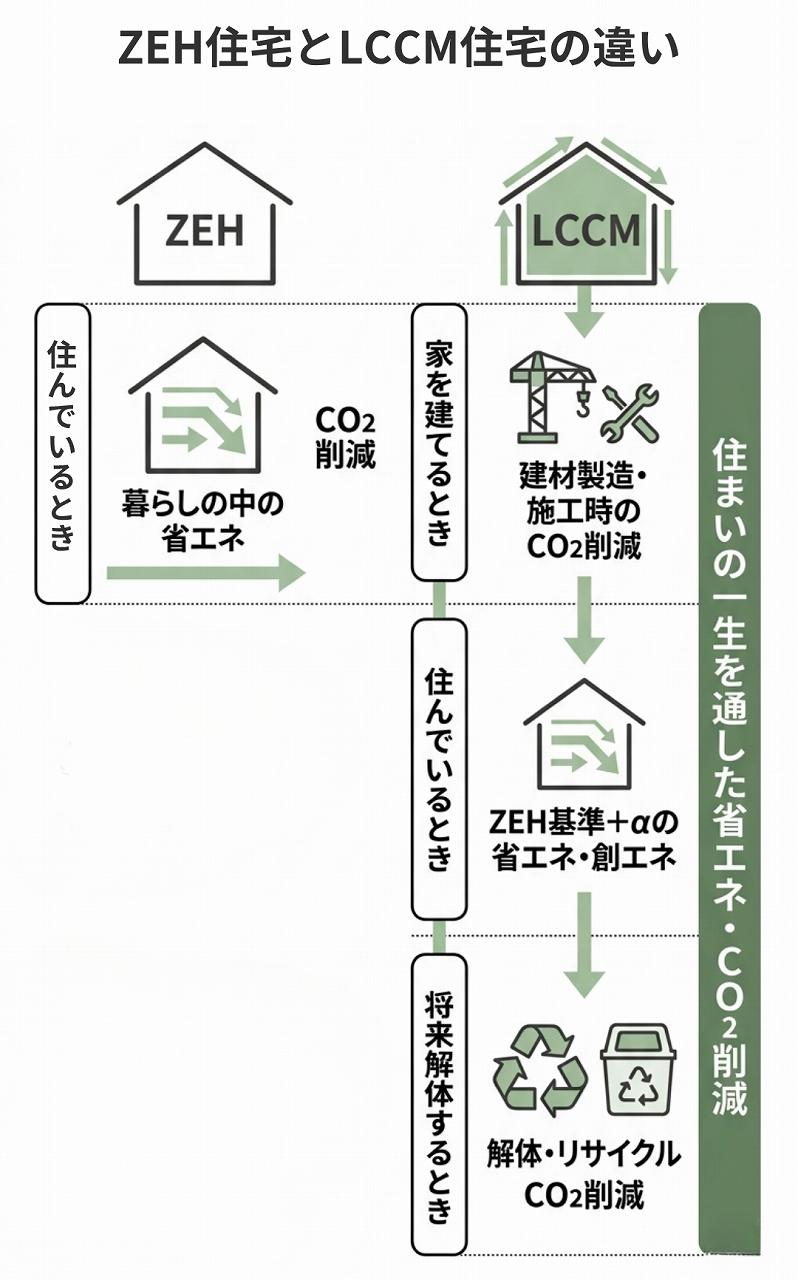 これまでの省エネ住宅であるZEHが、 住んでいる間のエネルギーを減らす家 だとすると、 LCCM住宅は、 家を建てるとき・住んでいるとき・将来解体するとき 住まいの一生を通して、 すべての期間でCO2削減を考えた住まい です。 POINT ▪ZEH → 暮らしの中の省エネ ▪LCCM → 住まいの一生を通した省エネ |